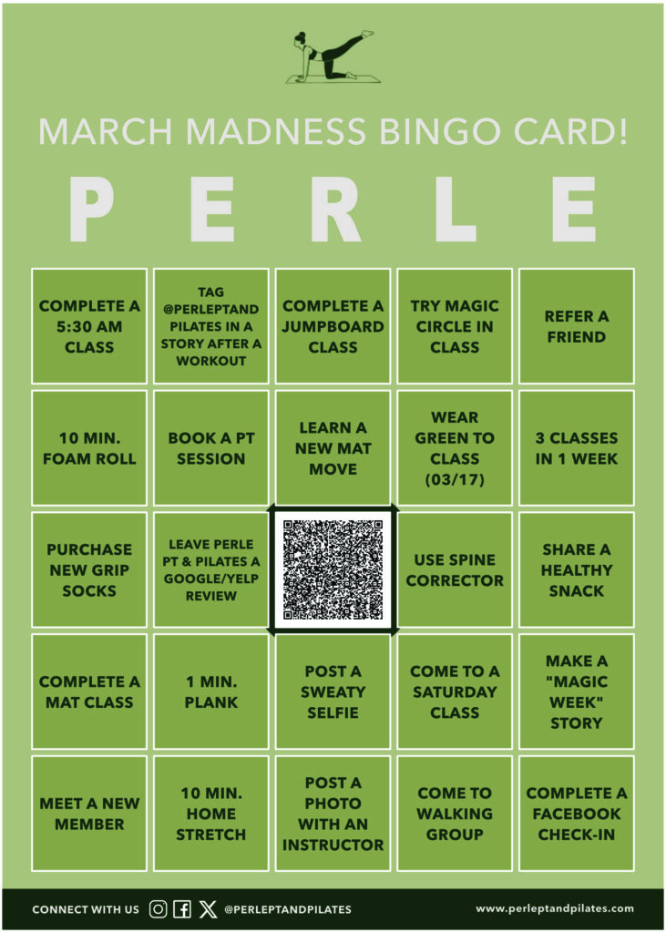 This month, your movement practice comes with a game board. Your Perle BINGO card is filled with fun, community-driven challenges like: